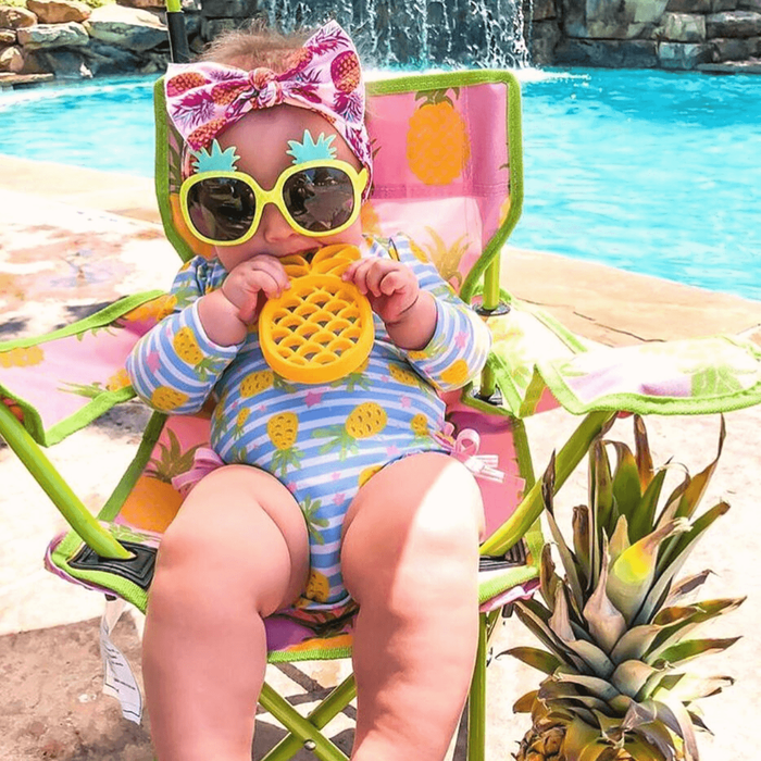 - Adorable silicone teether is designed with easy-grab handles for tiny hands