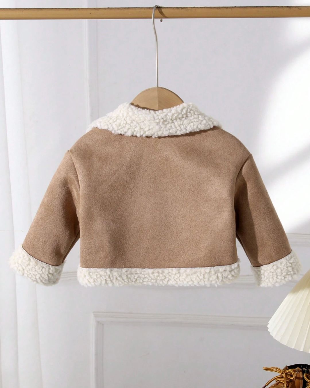 This cozy faux leather jacket features a soft inner lining and classic lapel collar β perfect for chilly days, outdoor play, or dressing up for family outings. Warm look, and comfy feel.