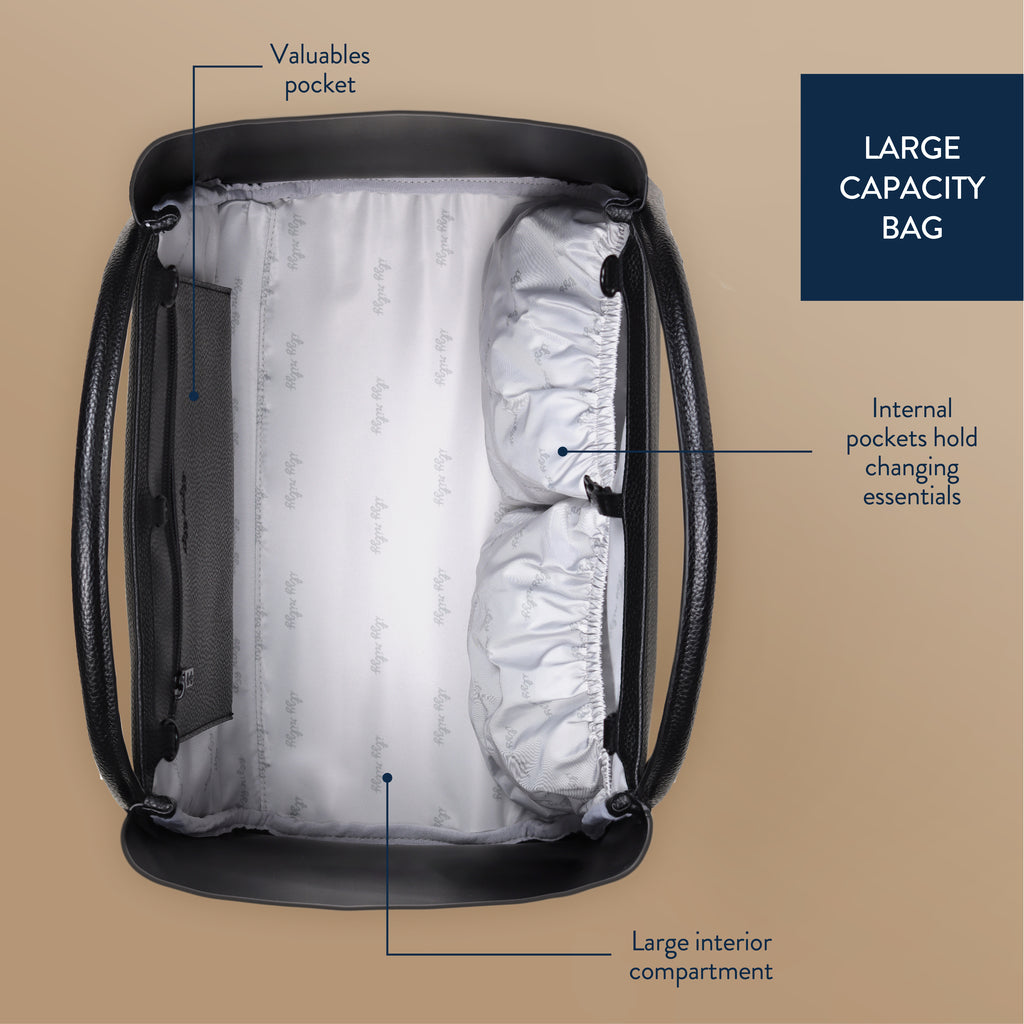 Meet the tote you'll never outgrow - from diaper bag for baby to chic purse for brunch! The Boss Tote is designed to move with you featuring an easy-wipe vegan leather exterior and the option to carry by handles or luxe, chain-detailed shoulder straps. Organization is a total breeze with a spacious main compartment offering multiple interior pockets for your valuables, changing essentials & so much more! Plus, a front pocket for easy access & hook closure to keep everything inside secure. Bonus: includes a coordinating changing pad, stroller straps, and removable tassel! Safe to say, you're going to tote-ally love it!