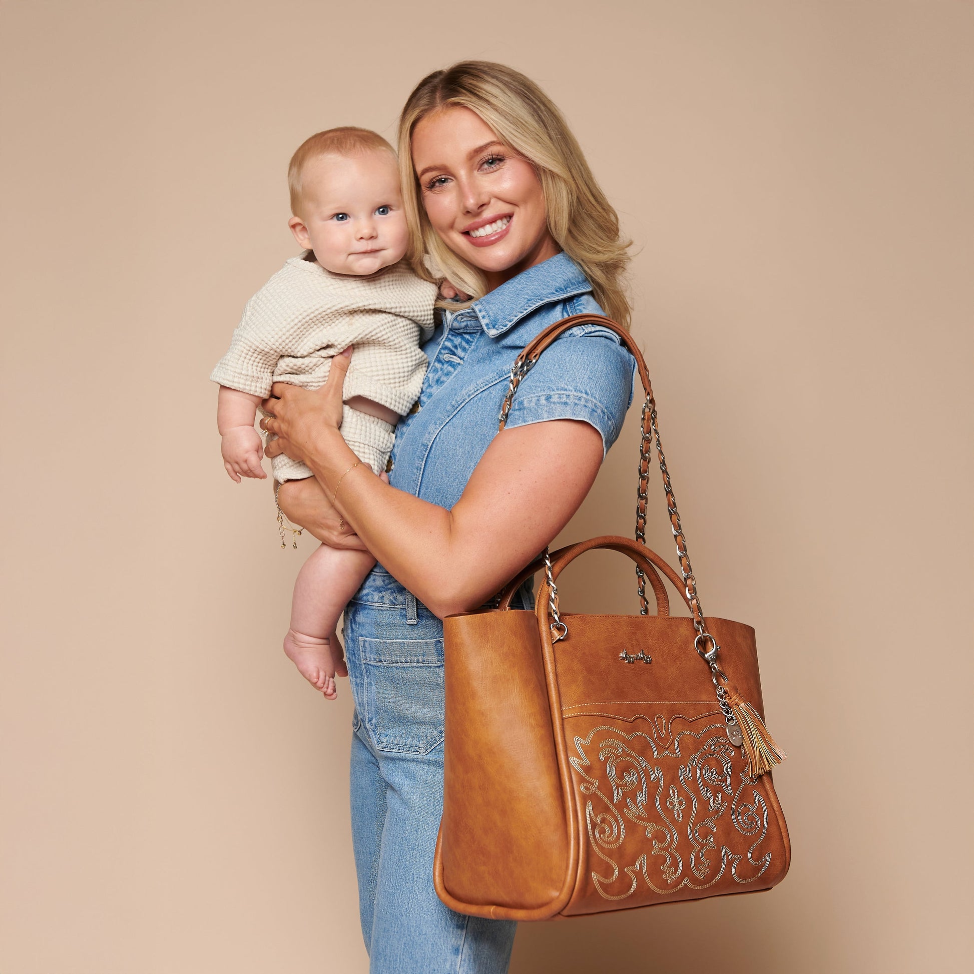 Meet the tote you'll never outgrow - from diaper bag for baby to chic purse for brunch! The Boss Tote is designed to move with you featuring an easy-wipe vegan leather exterior and the option to carry by handles or luxe, chain-detailed shoulder straps. Organization is a total breeze with a spacious main compartment offering multiple interior pockets for your valuables, changing essentials & so much more! Plus, a front pocket for easy access & hook closure to keep everything inside secure. Bonus: includes a coordinating changing pad, stroller straps, and removable tassel! Safe to say, you're going to tote-ally love it!