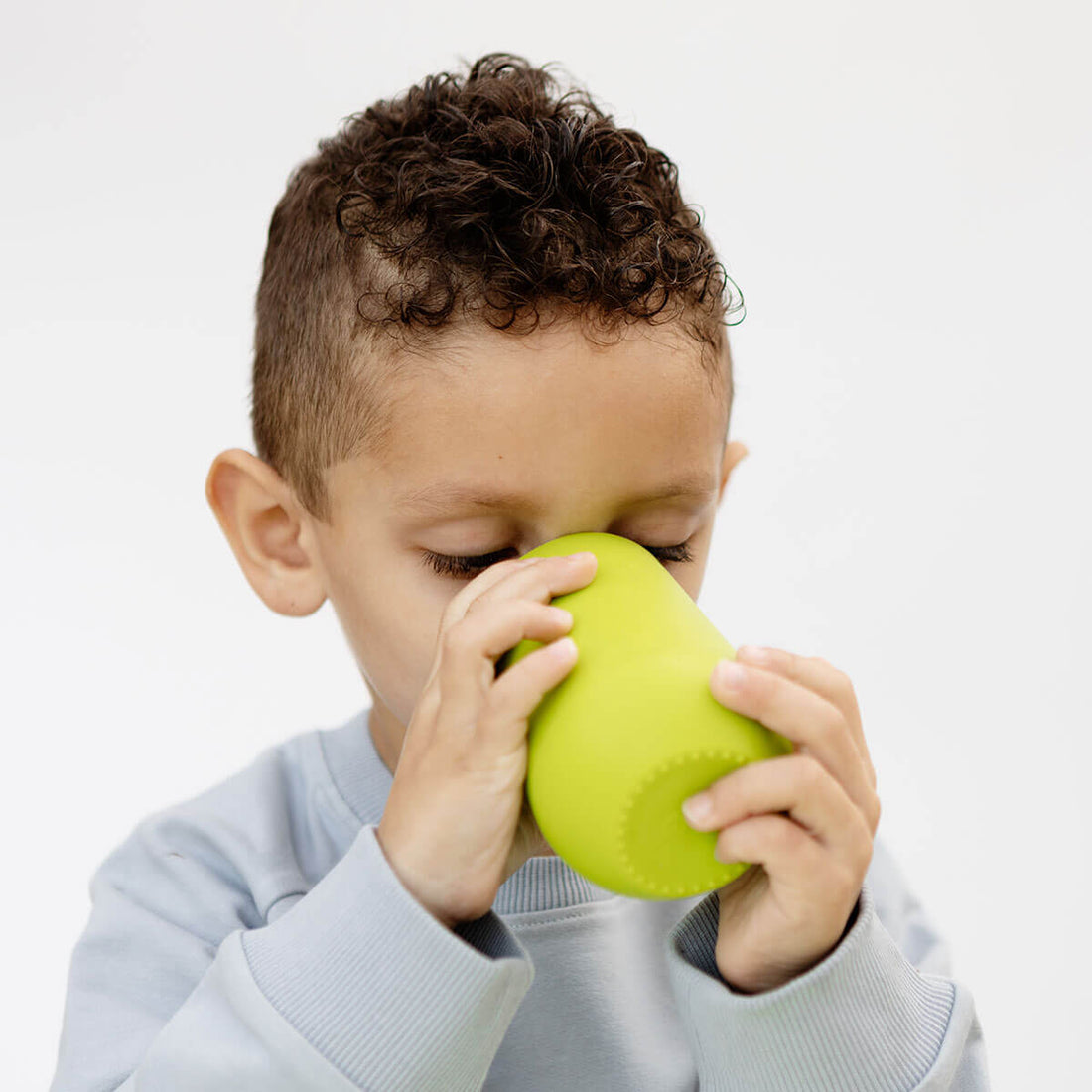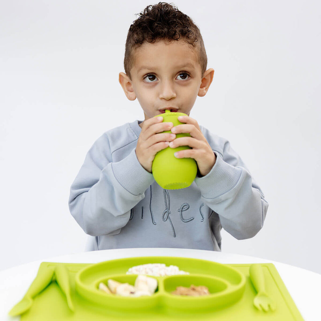 Learning to drink from a straw is an important developmental milestone that develops lip rounding and promotes speech development. The ezpz Happy Cup + Straw System teaches older toddlers and preschoolers to safely drink from an open cup and straw independently.