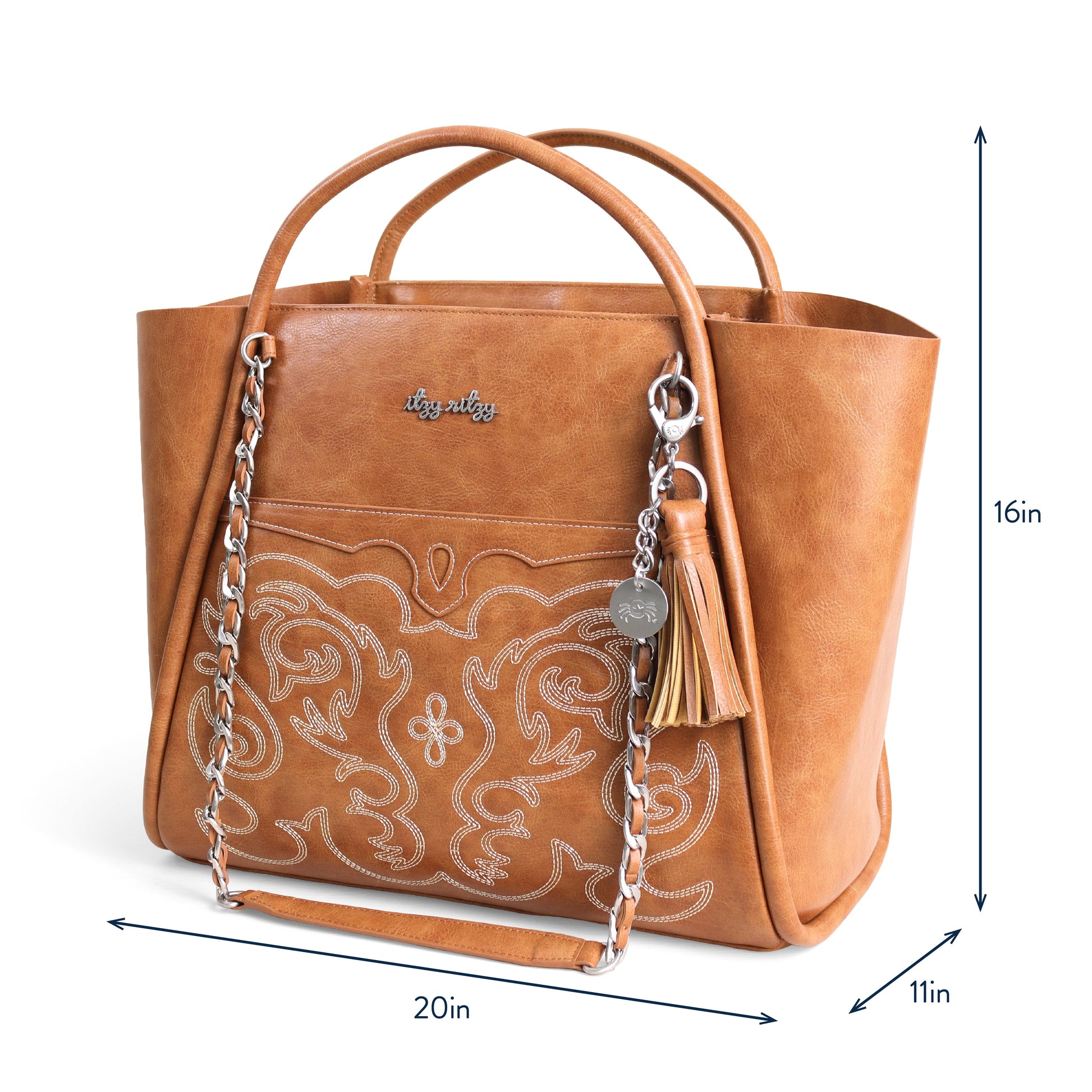 Meet the tote you'll never outgrow - from diaper bag for baby to chic purse for brunch! The Boss Tote is designed to move with you featuring an easy-wipe vegan leather exterior and the option to carry by handles or luxe, chain-detailed shoulder straps. Organization is a total breeze with a spacious main compartment offering multiple interior pockets for your valuables, changing essentials & so much more! Plus, a front pocket for easy access & hook closure to keep everything inside secure. Bonus: includes a coordinating changing pad, stroller straps, and removable tassel! Safe to say, you're going to tote-ally love it!